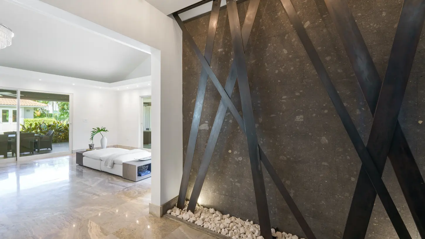 Dramatic porcelain countertop with four, barstool service