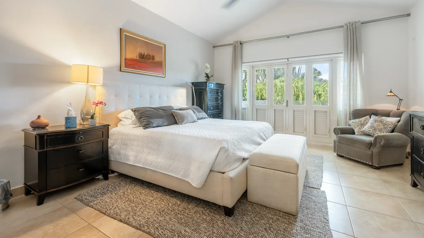 Bedroom #2 en-suite: King Size Bed w/end-of-bed bench/stool; bedside credenzas & lamps; a “sink-into”, giant armchair w/footstool; flat-screen TV; Split A-C plus ceiling fan. Adjacent private terrace with café table and chairs under a wood trellis.