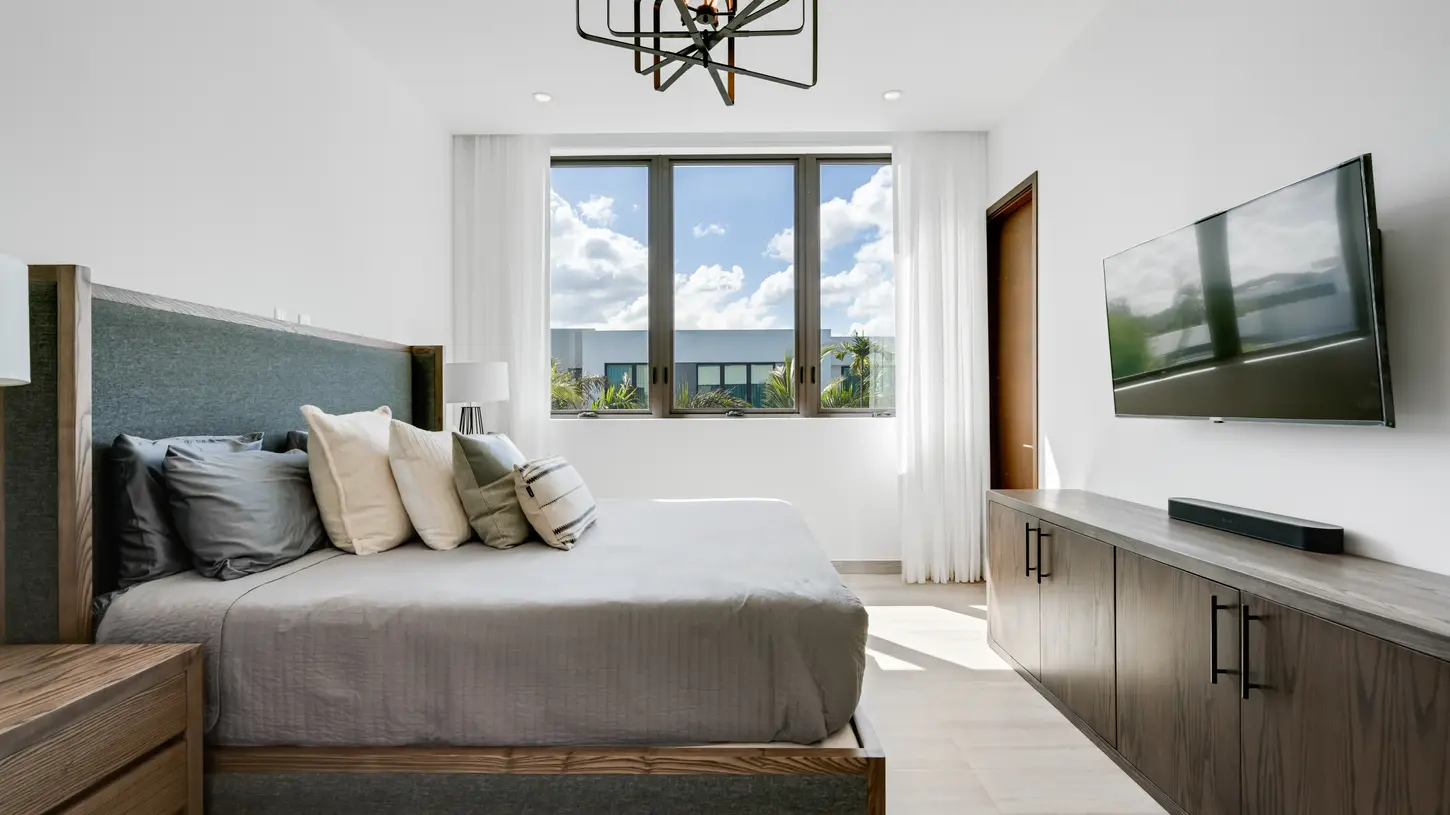 ● Bedroom 4 (First Floor): This room has a king-sized bed, an ensuite bathroom, a walk-in closet, a 40-inch TV, and a sound bar. It also has a central A/C unit.